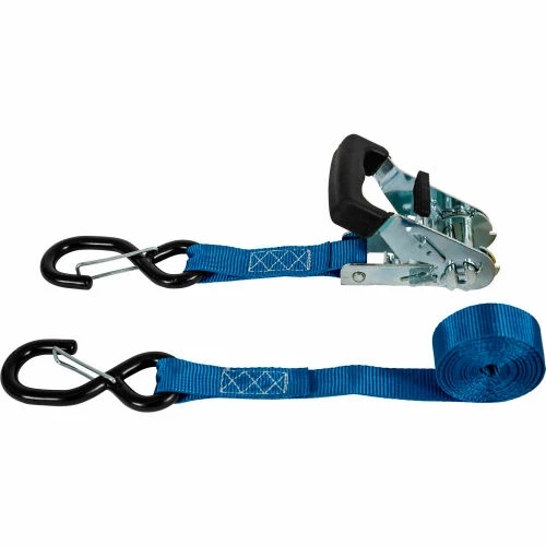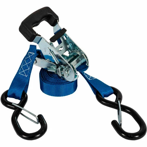 Buyers Products 10 Foot Standard Duty Ratchet Tie Down with Thru-Handle is ideal for securing small equipment, ATVs, tool chests, and more. The durable polyester strap is 1 in. wide and carries a working load limit of 600 lb. The rubber through handle gives you a comfortable grip for precise control over the tension of the strap. Vinyl coated steel S-hooks help protect your cargo and equipment from scratches and easily attach to your anchoring hardware. Metal components are white zinc plated for corrosion resistance.