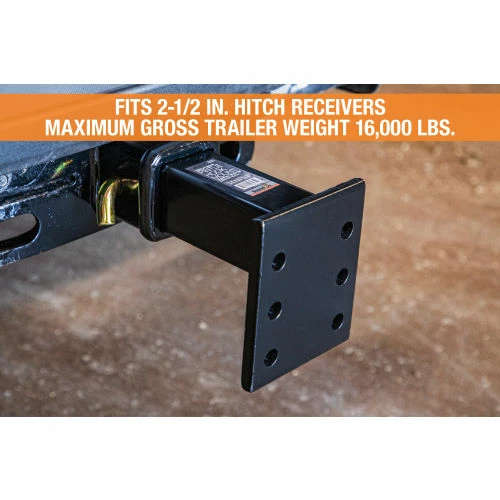 Buyers Products 2-1/2″ Pintle Hook Mount slides into a 2-1/2″ receiver to provide a mounting plate for a variety of pintle hooks and combination hitches. The pintle hook mount features three pairs of mounting holes for a two position mount. The strong, durable construction features continuous welds and a black powder-coated finish for corrosion resistance.