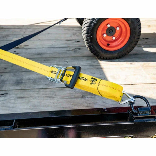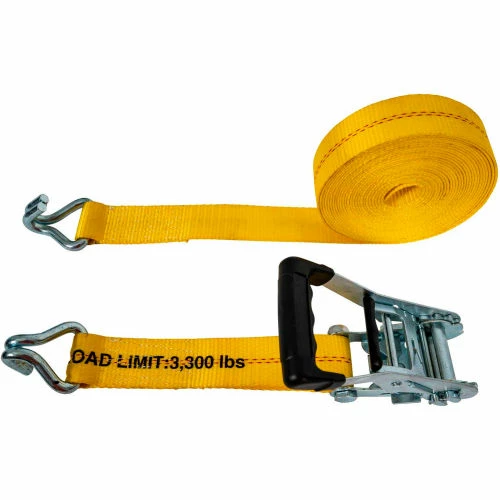 Buyers Products Commercial Grade Ratchet Strap with Soft Rubber Grip Series delivers robust holding power to safely secure heavy cargo. The wide padded through handle provides a comfortable full-hand grip with or without gloves on. The ratchet mechanism makes it easy to precisely adjust tension. Also, this item includes weather-resistant polyester straps 2 in. wide and 30 ft long with a working load limit of 3300 lb.