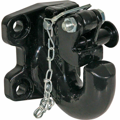 The bolt-on 30 Ton Pintle Hook from Buyers Products features tough, drop-forged steel construction and a black powder-coated finish for maximum durability and resistance to corrosion. Ideal for contractors and haulers of heavy equipment, the hook will handle maximum gross towing weights of up to 60,000 lb. Each pintle hook includes mounting information, specs sheet, drilling template, and vehicle capacity decal. It is available with just the pintle hook or sold with a mounting kit.