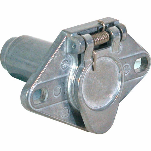Buyers Products 6-Way Die-Cast Zinc Trailer Connector is a round terminal pin, truck-side connector. It attaches to your vehicle and is commonly used to make a power connection between the vehicle and a utility trailer. It features a durable, die-cast zinc construction with a spring-loaded door to protect the round terminal pins when not in use.
