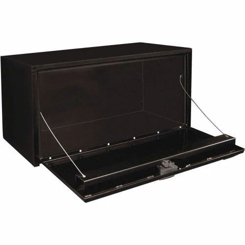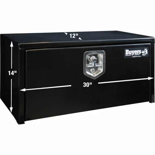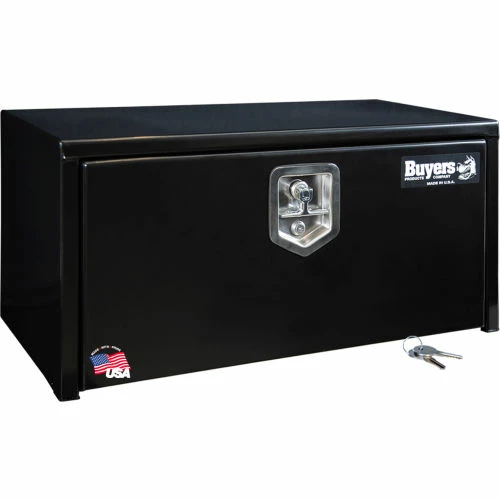 Buyers Products Black Steel Underbody Truck Box with T-Latch is made of strong 14 Ga steel with a 12 Ga drop door that can handle the harshest job sites. This underbody truck box is powder coated black inside and out for superior corrosion resistance and style. The continuous hidden hinge and replaceable gasket system keeps weather and grime away from your tools. Aircraft grade cables help prevent damage. The locking stainless steel compression latch provides a tight seal and deters theft.