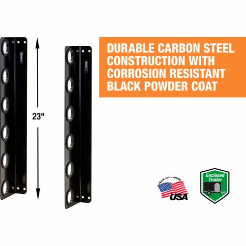 The Buyers Products’ Hand Tool Rack keeps your long handle tools organized and secure for transport. Designed to accommodate up to 6 long handle tools, the rack is ideal for enclosed style trailers. The multi-point mounting secures to the trailer floor and also the trailer top rail. Includes rubber grommets to protect tools. Mounting hardware is included. Black powder coat finish.