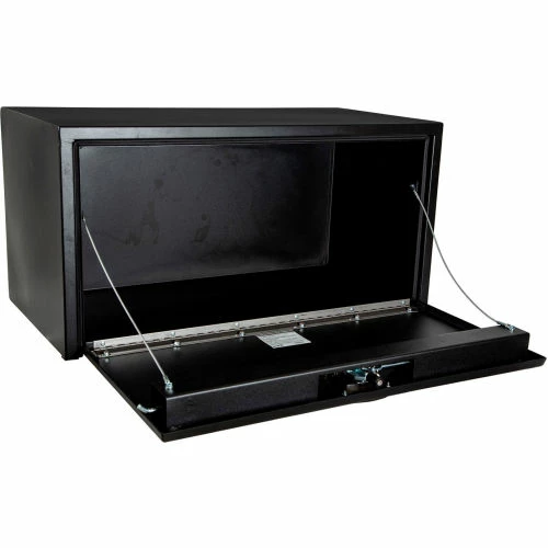 Protect and secure your equipment for the long haul with a Buyers Products Underbody Truck Box. Each professional grade box is made of strong 14 Ga steel with a 12 Ga drop door. It is powder coated textured matte black inside and out for superior corrosion resistance and style.The continuous hidden hinge and replaceable gasket system keep weather and grime away from your tools. The locking, 3-point die-cast compression latch provides a tight seal and deters theft. Aircraft grade cables keep the door from slamming open and causing damage. Mount the box on any flat surface or under your truck bed using Buyers Products Steel Mounting Brackets (sold separately).