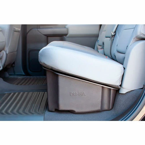 - The DU-HA® fits underneath the pre-existing back seats of your truck. If your Truck has a factory storage tray it must be removed