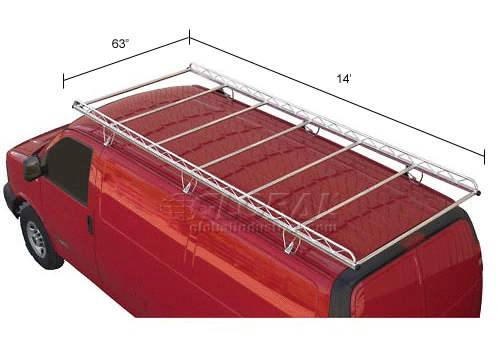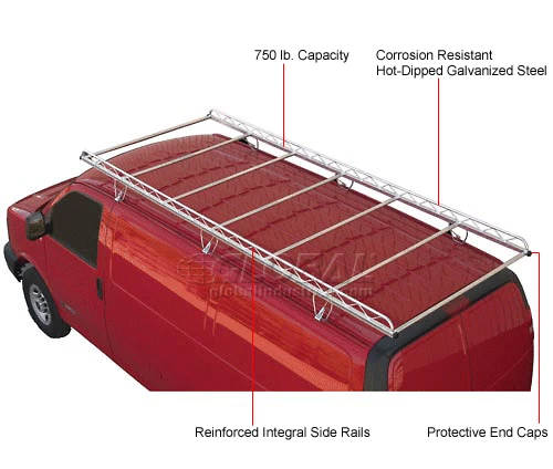 This van cargo rack easily carries oversized cargo including lumber, ladders and equipment. Integral side rails help to contain the load and offer convenient tie down positions. Rack is constructed of hot-dipped galvanized steel for corrosion resistance and strength, and is literally designed to outlast the vehicle it is mounted on. Support brackets feature a patented mounting design that offers easy installation without drilling.