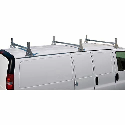 This economical van cargo rack is ideal for carrying ladders, pipes, steel and lumber. Patented mounting design offers easy installation without drilling. Galvanized steel construction offers superior durability and corrosion resistance. Standard 2 rack package offers 500 lb. capacity; purchase additional rack to increase capacity to 750 lbs.