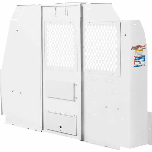 Bulkheads separate the driver compartment from the cargo area for maximum protection against shifting loads. Designed for Full-Size Ford and GM vans, the Model 96102-3-01 screen bulkhead provides additional driver and cargo protection with a large area to mount accessories. Heavy gauge steel is used for strength and durability. Improved impact resistance protects you from loose object in the cargo area. Brite White ARMOR-TUF® Powder Coat finish. Easy installation with sidewall and roof mounting brackets and pre-punched mounting holes for WEATHER GUARD® accessories. New vertical panel design reduces ambient noise levels. Exclusive 9 in x 12 in Dog Hatch™ Door allows easy loading of long materials by utilizing the floor space in front of the bulkhead. Optional Hinge Kit converts bulkhead to swing door version.